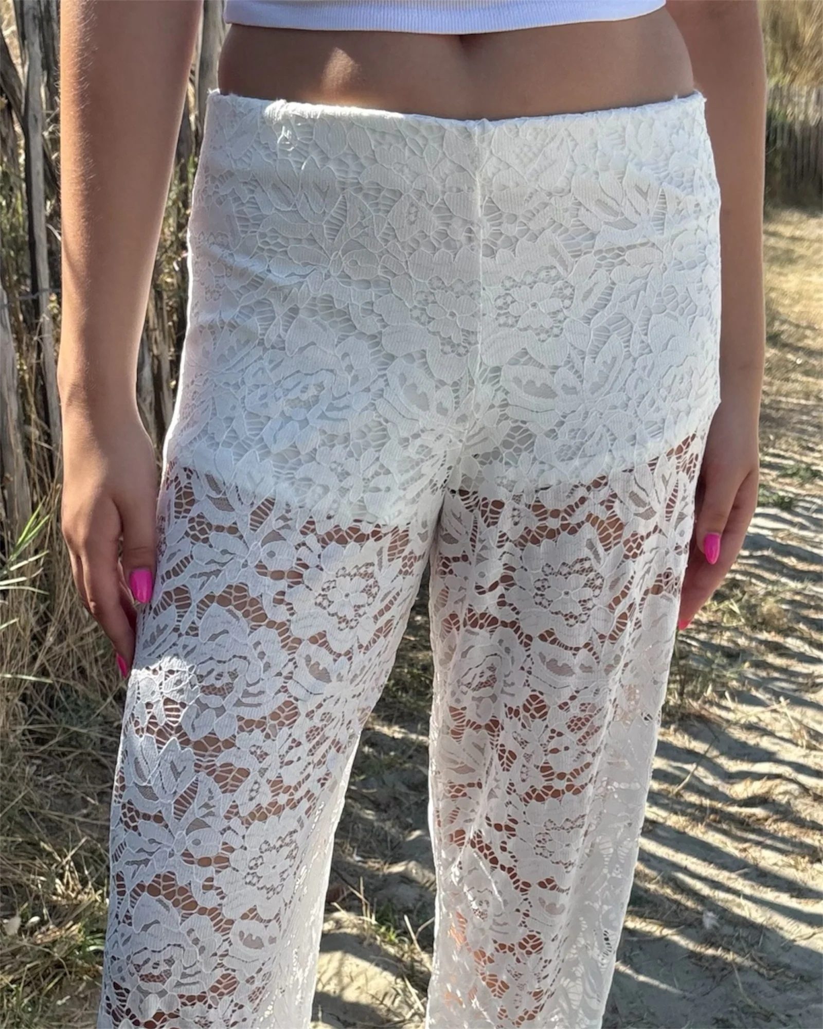 PiÚce forte de la saison, ce pantalon en dentelle ajourée dévoile subtilement les jambes tout en assurant confort et maintien grùce à son short intégré en coton.