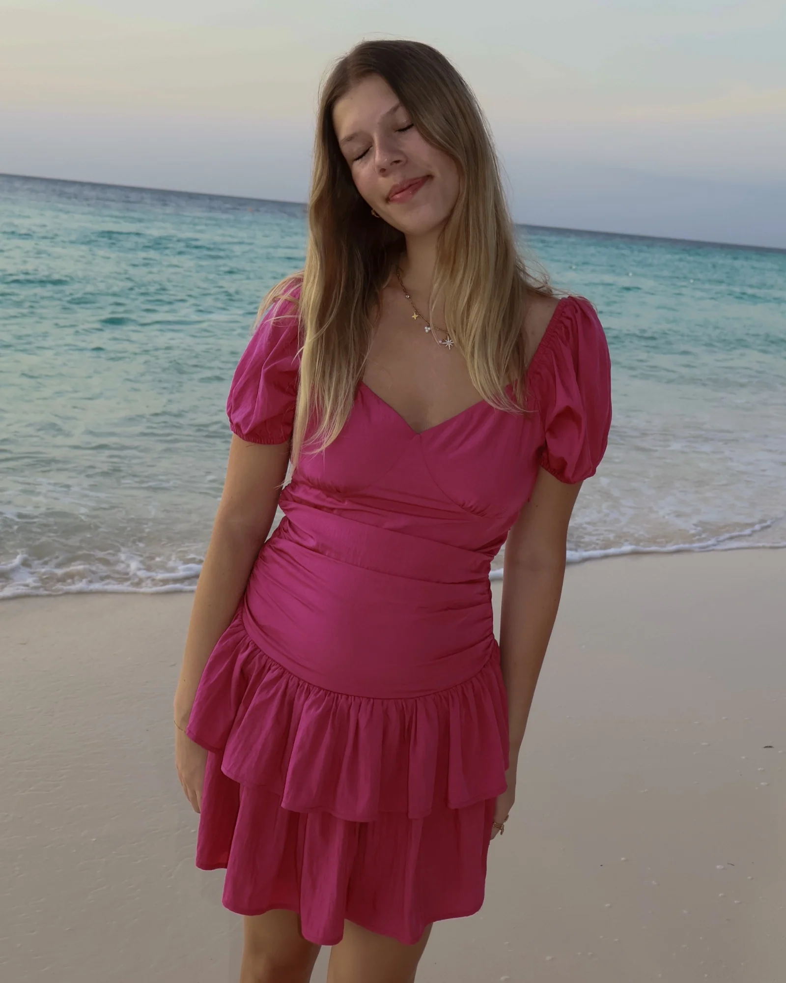Douce et ultra féminine, cette robe courte rose apporte une touche romantique et lumineuse à votre silhouette. Son décolleté en V met délicatement en valeur le buste, tandis que ses manches courtes légÚrement bouffantes ajoutent une note tendre et élégante.