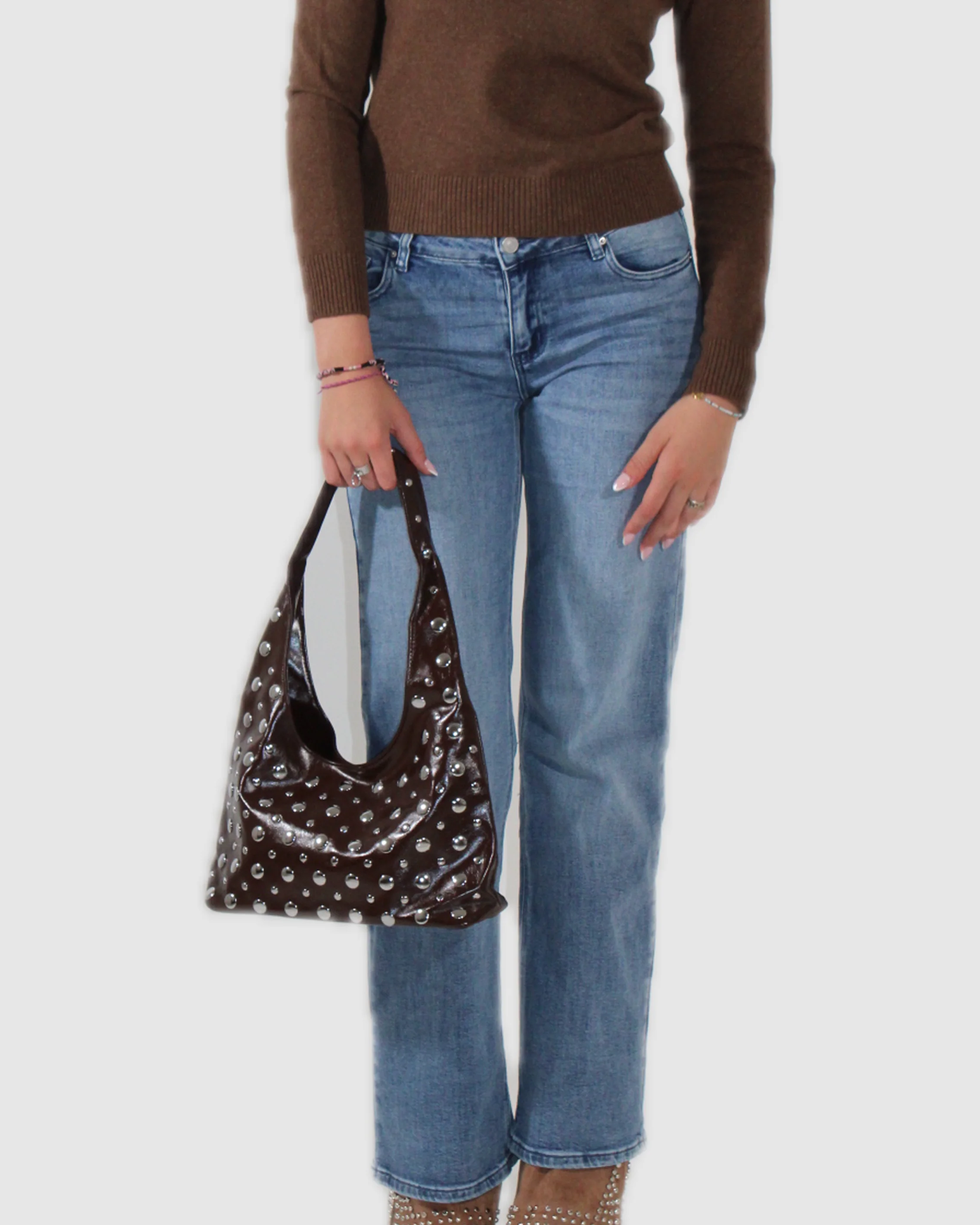 Sac Ă©paule effet vernis, ornĂ© de clous mĂ©talliques pour un look tendance et affirmĂ©. Son format pratique permet de lâutiliser au quotidien tout en apportant une touche mode et originale Ă vos tenues.